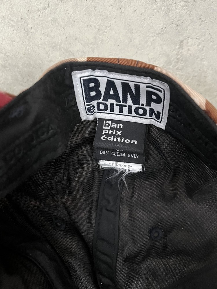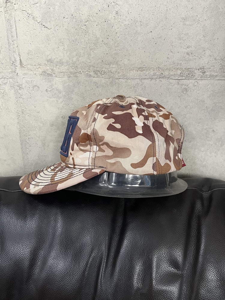 데저트 카모 패턴 위에 핑크색 패치 그리고 보라색 단어의 색 조합은